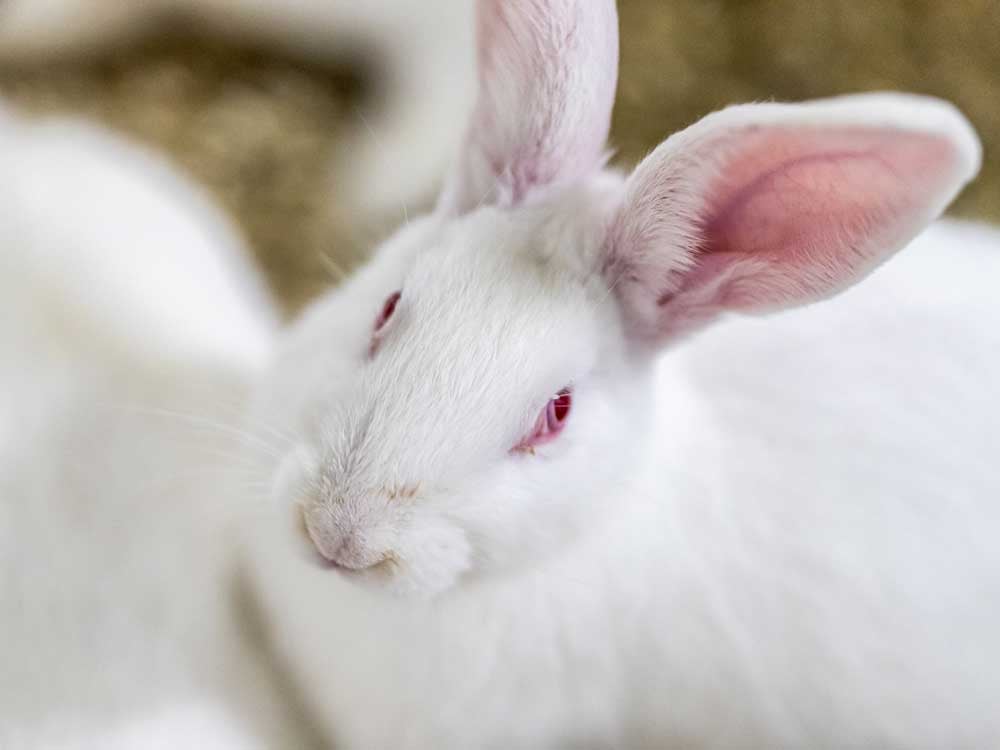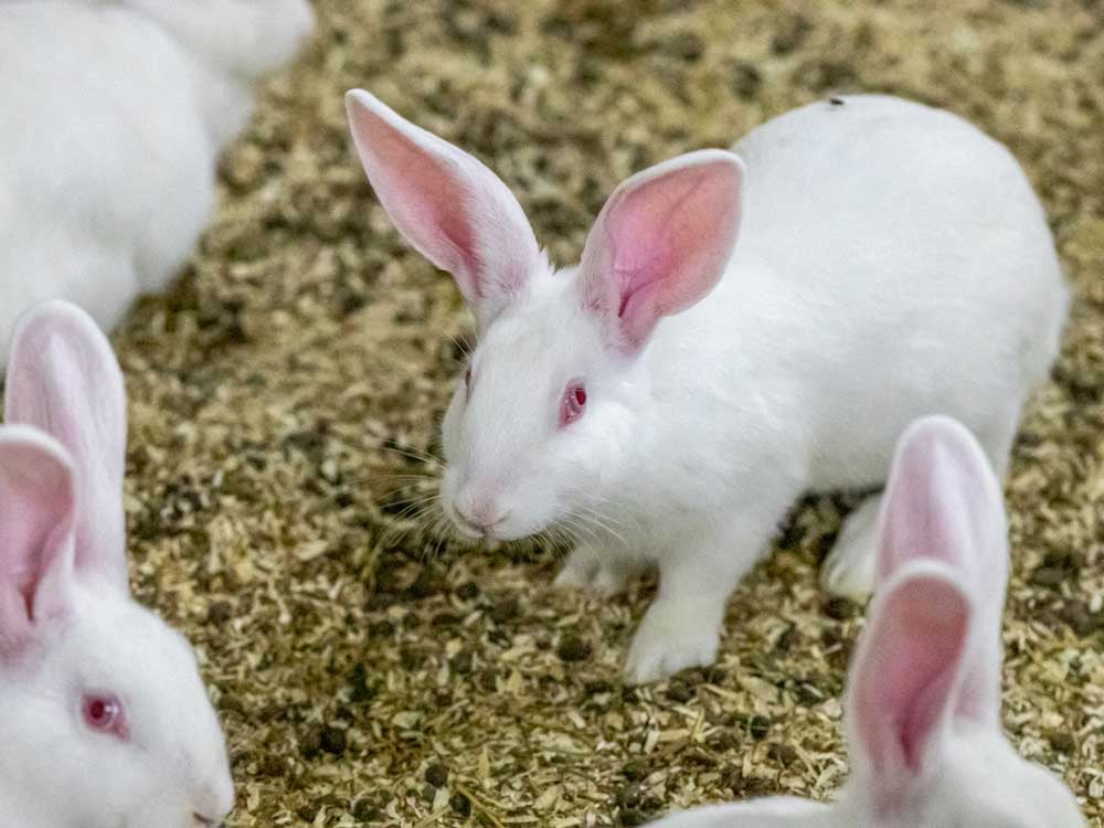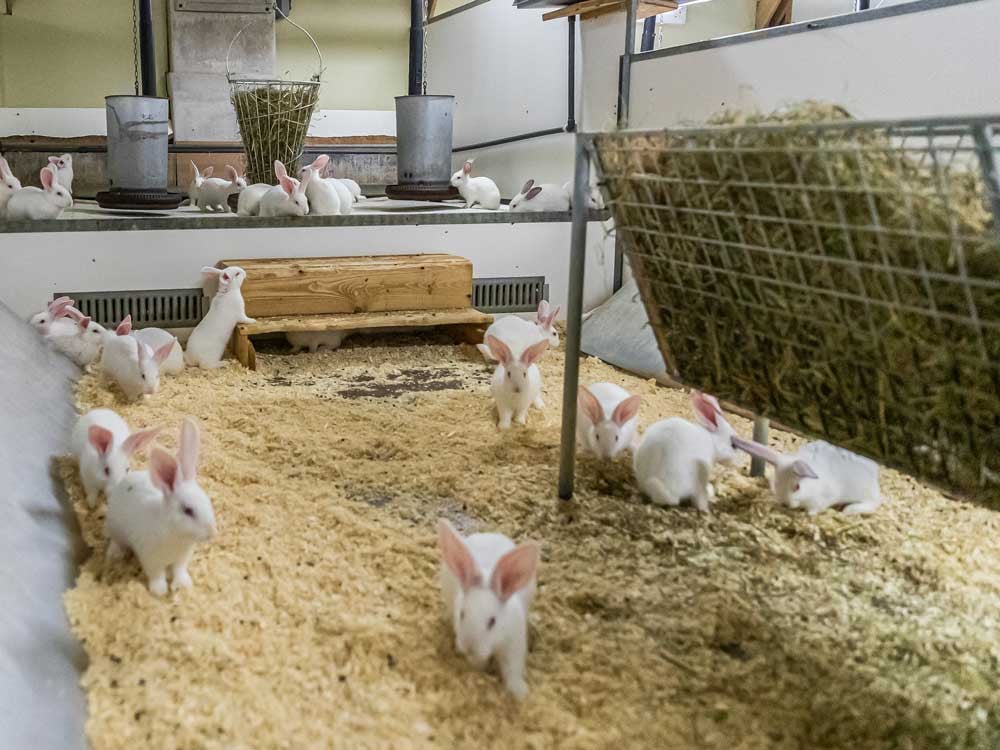 Verschiedene Altersgruppen tummeln sich im Stroh. Den Kaninchen scheint es zu gefallen – dafür bieten wir Ihnen auch den für eine Gruppenhaltung erforderlichen Platz. Er muss insgesamt pro Tier grösser sein als bei der Einzelhaltung. So verfügt jedes Tier für sich über eine grössere begehbare Fläche.